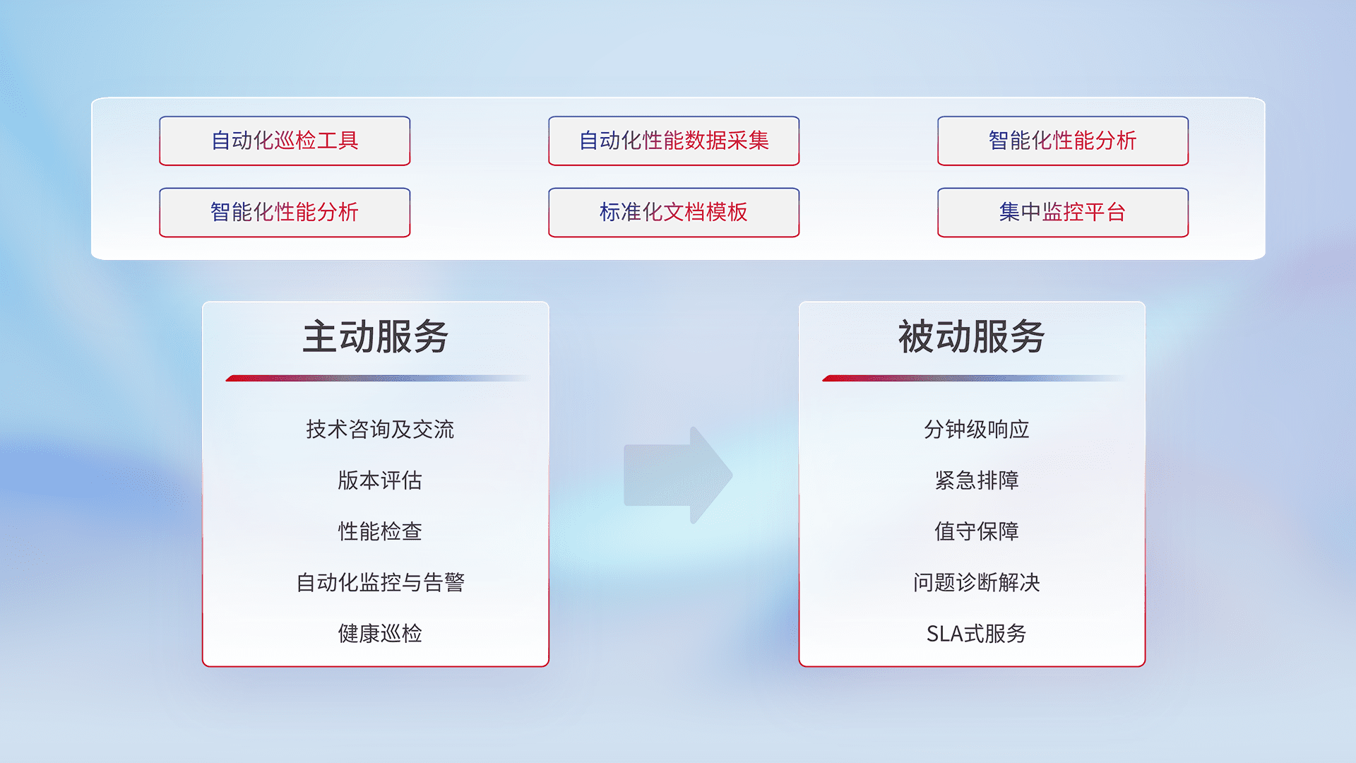 智能化工具和标准化文档,,保障服务质量,,提供主动服务(包含技术咨询、、、、版本评估、、、性能检查、、自动化监控与告警、、健康巡检)和被动服务包含(分钟级响应、、紧急排障、、值守保障、、问题诊断解决、、SLA服务)。。